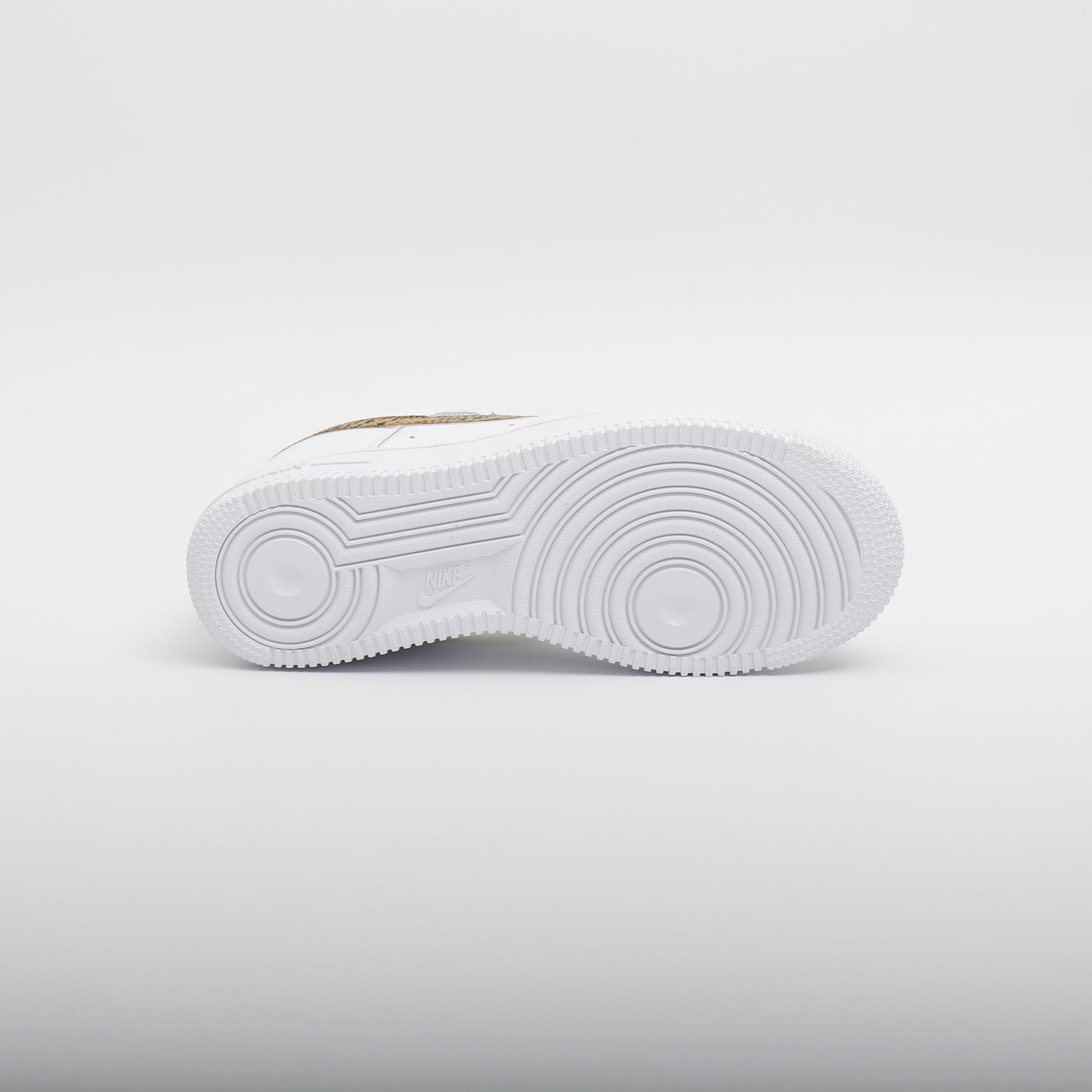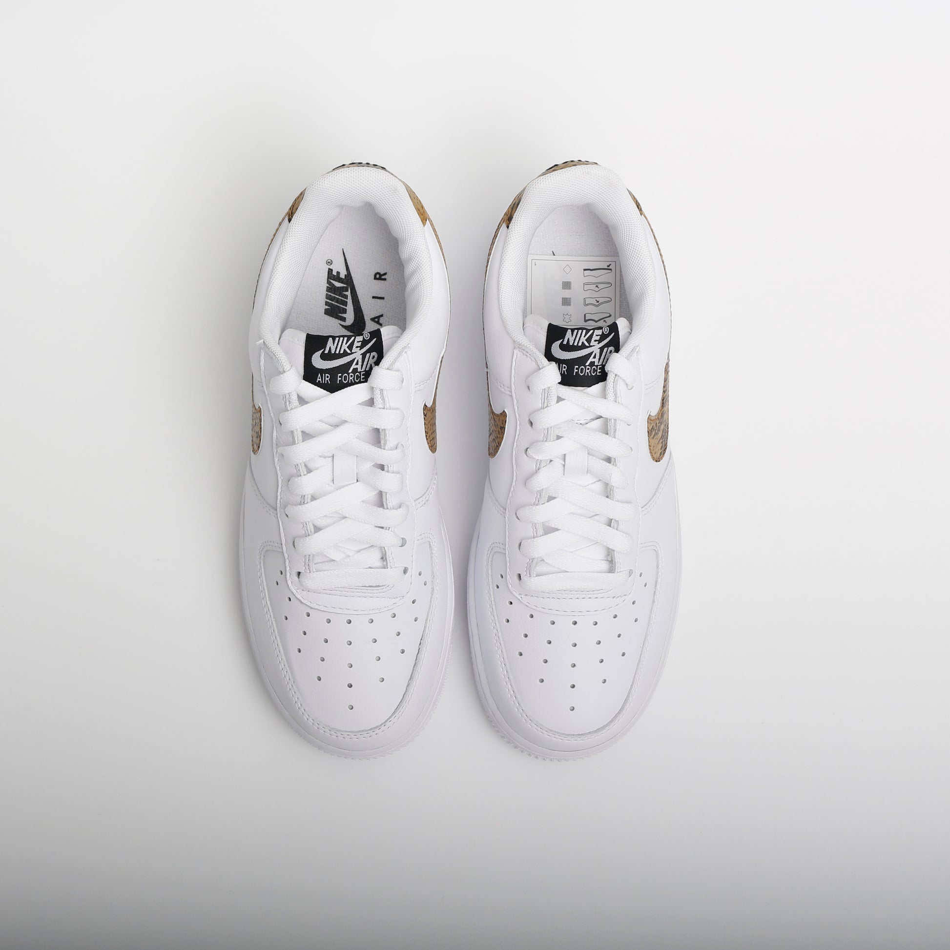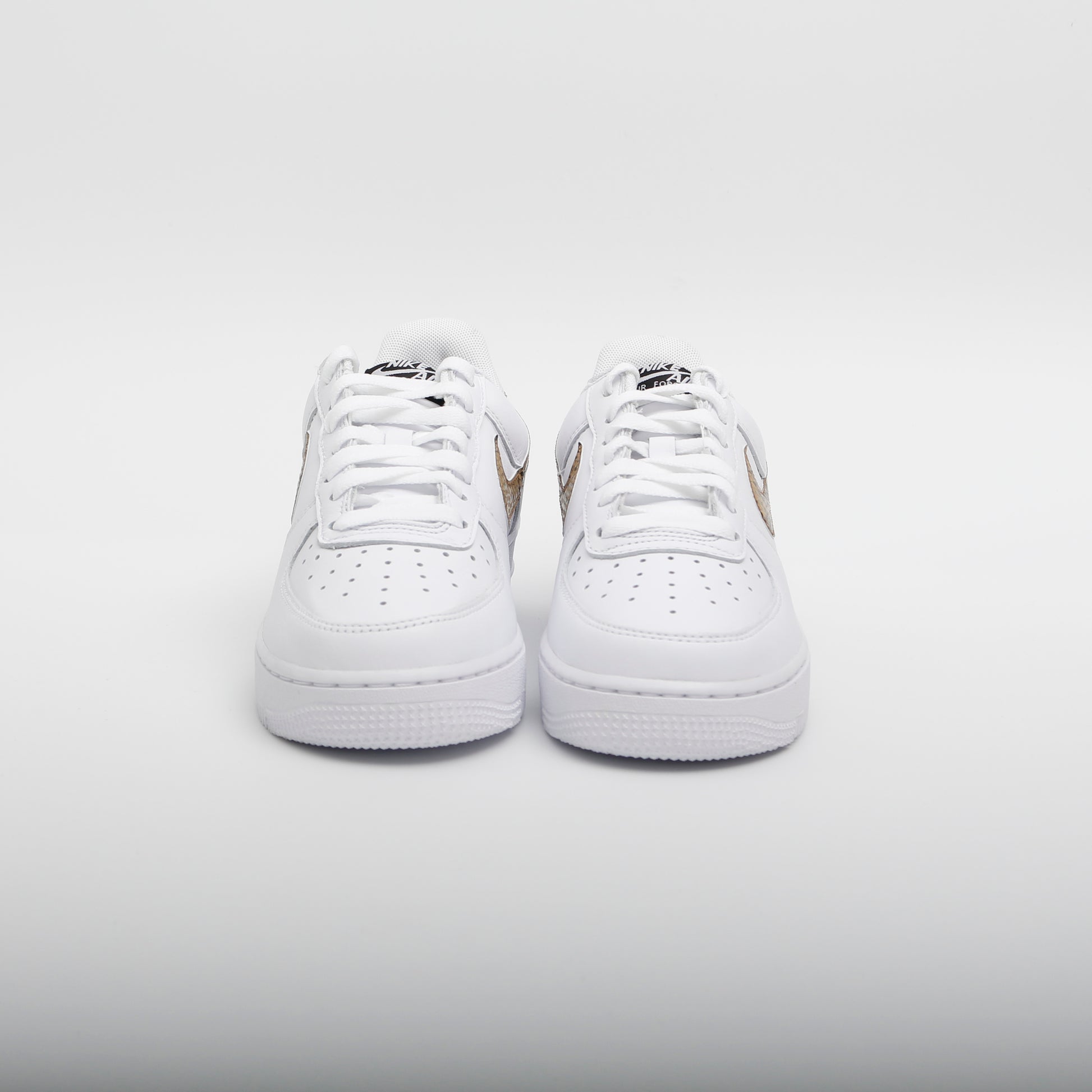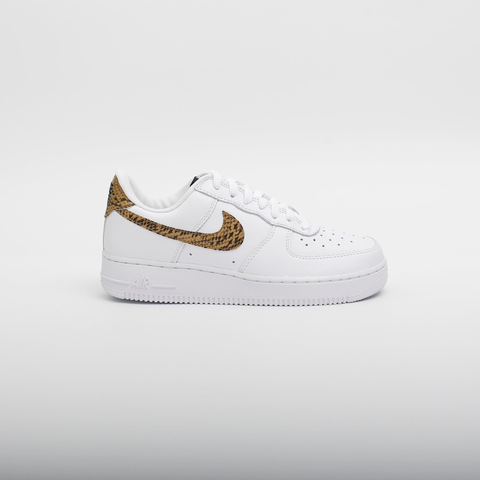 The classic Air Force 1 style, crisp leather, stunning white colourway with an 'element gold' snake-print swoosh, a very clean style. Unisex colourway.