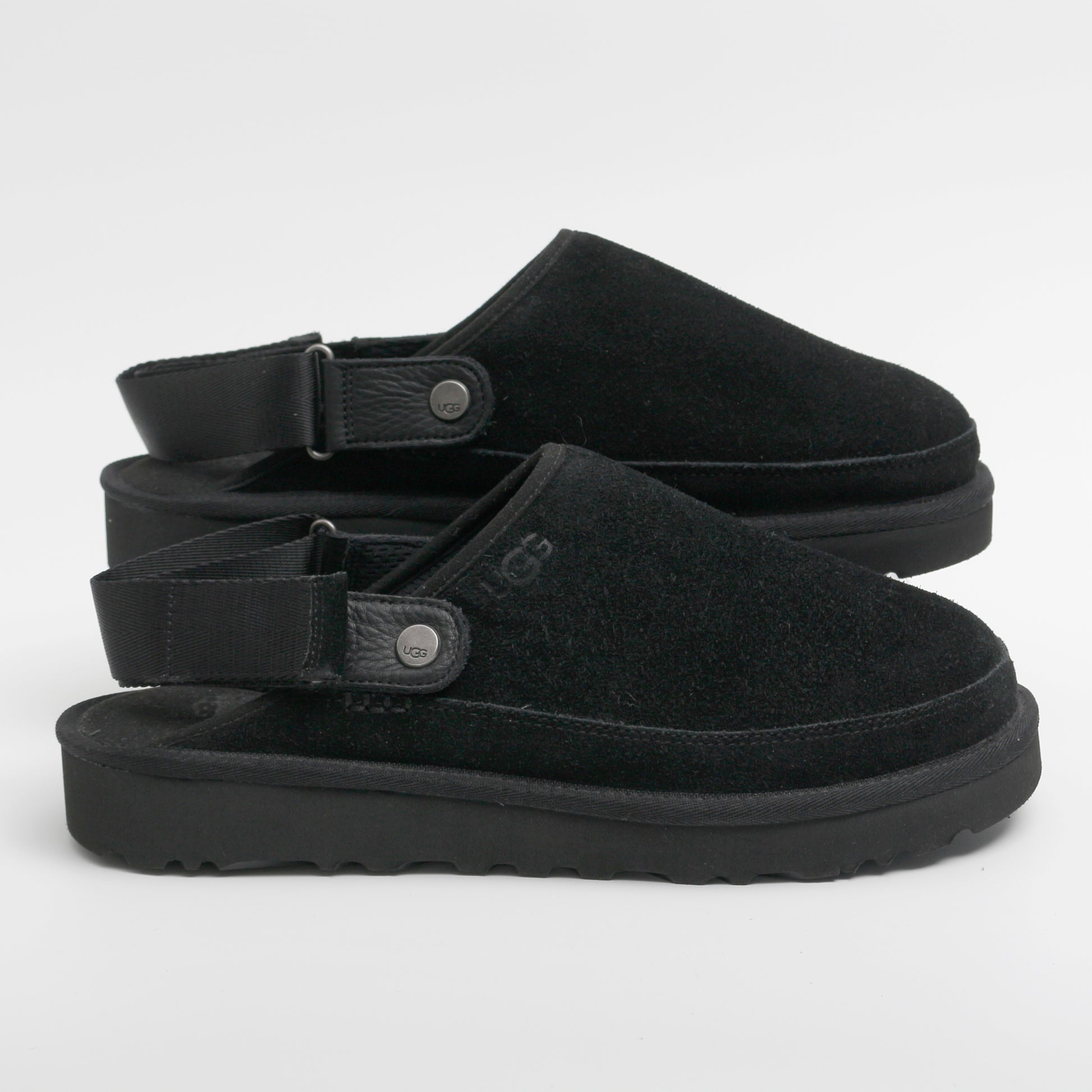 The goldencoast clog. Featuring a suede upper and adjustable strap this is the perfect mule to keep you comfy and cosy. A rubber outsole making these perfect for any surprise adventures. UGG branding on the front, sides and heel in black completing the look.