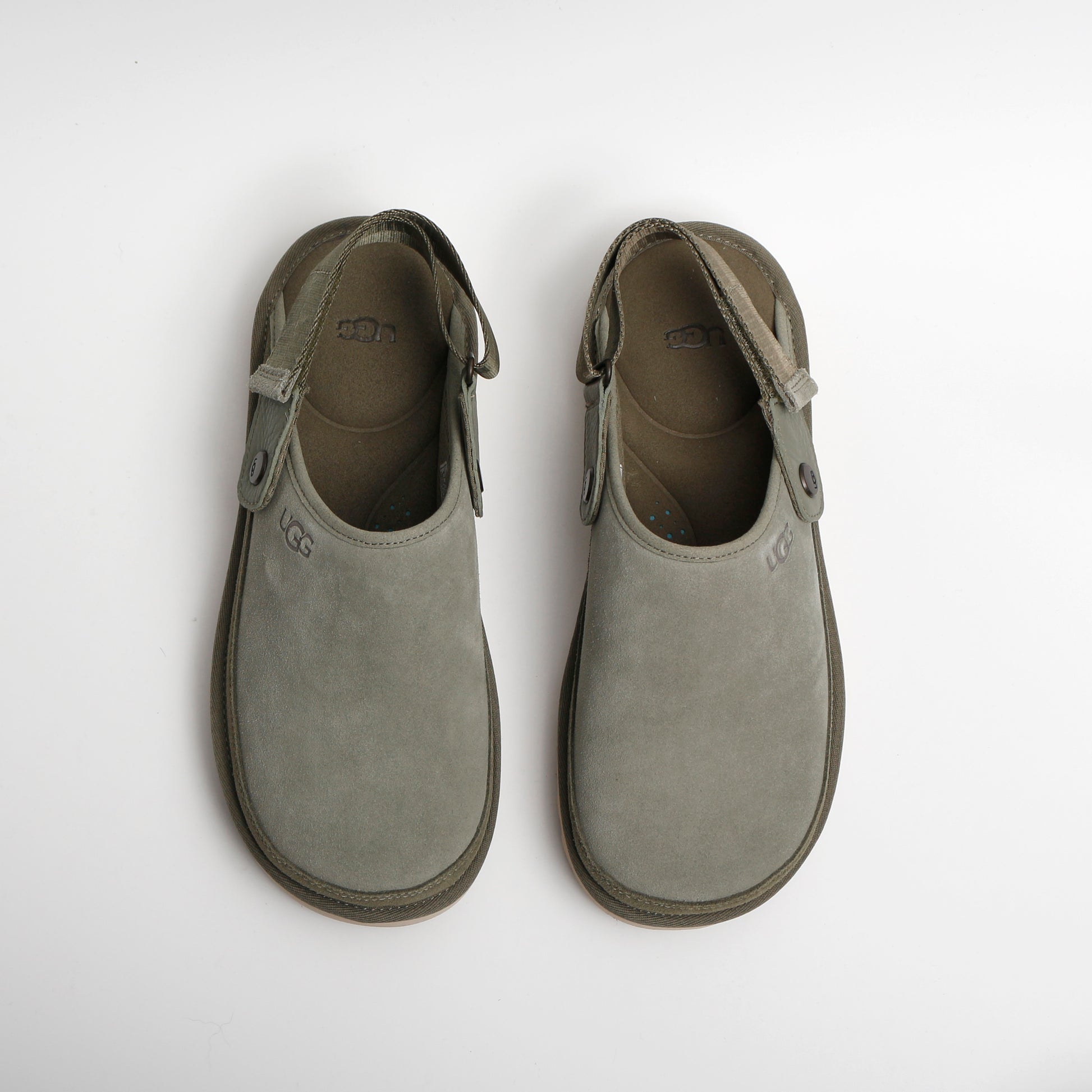 The Goldencoast clog by UGG. Featuring a khaki suede upper and adjustable strap this is the perfect mule to keep you comfy and cosy. A rubber outsole making these perfect for any surprise adventures. UGG branding on the front, sides and heel in black completing the look.
